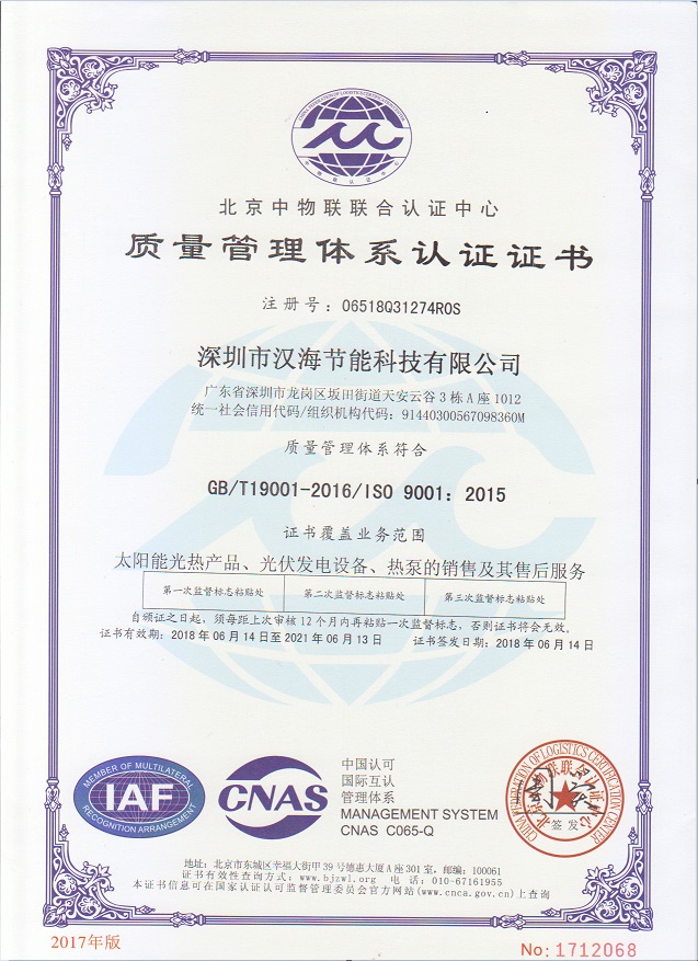 深圳市漢海節(jié)能科技有限公司成立于2011年,注冊資金6000萬元,總部設在深圳,是一家集設計、研發(fā)、施工于一體的專業(yè)化從事太陽能中央熱水工程、熱泵中央熱水工程、中央空調、光伏發(fā)電、水處理等新能源及節(jié)能環(huán)保行業(yè)的綜合服務商和工程商。在將近10年的發(fā)展歷程中,始終走在行業(yè)發(fā)展的前沿,是專業(yè)從事太陽能光熱、光伏,空氣源、太陽能熱水工程、水源熱泵,中央空調,水處理產(chǎn)品的設計、安裝、售后服務為一體的高新技術企業(yè);是專業(yè)提供太陽能中央熱水工程、熱泵中央熱水工程、中央空調工程、光伏發(fā)電工程、水處理工程、太陽能熱水工程等全面解決方案的供應商和工程商,產(chǎn)品涵蓋太陽能集熱器、空氣源熱泵、水源熱泵、中央空調、光伏組件、太陽能熱水工程等,是新能源的倡導者和推動者。公司成立以來,始終秉承“誠信、責任、專業(yè)、高效”的服務宗旨,以市場需求為導向,以為客戶創(chuàng)造價值為己任的精神,不斷開拓創(chuàng)新,通過多年的快速發(fā)展,公司綜合實力躍居行業(yè)前列。漢海擁有一支經(jīng)驗豐富、善打硬仗的專業(yè)高效團隊;擁有一批專業(yè)的高級工程師、中級工程師、二級建造師、造價工程師、電氣設計師、給排水設計師;擁有一批機電、安防、水、電等專業(yè)技術施工和售后人員,配備先進齊全,實力雄厚,技術領先。漢海以質量樹信譽、以工藝立標桿、以管理創(chuàng)效益、以服務得人心,工藝水平在業(yè)界獨樹一幟,成為行業(yè)模仿的典范。漢海承建的機電工程(設計、施工)涉及星級酒店、賓館、高檔辦公樓、花園別墅、住宅小區(qū)、學校、水療中心、工廠等各種類型的工程,工程項目遍布全國各地。漢海將致力于成為全球信賴的新能源綜合服務商,為客戶提供新能源的全方位解決方案。未來,漢海將依托國家政策,積極開拓粵港澳大灣區(qū)、中國特色社會主義先行示范區(qū)市場及“一帶一路”沿線國際市場,推動新能源的新輝煌。